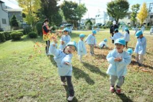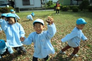 落ち葉拾いが盛り上がり、みんなで「落ち葉合戦!」落ち葉をかけ合ったり上に投げておちる葉を被ってみたりと秋ならではの自然を感じることができました。