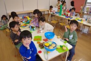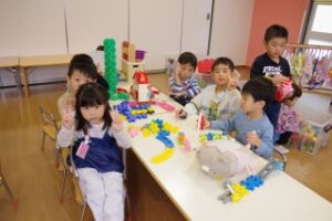 室内遊びでは、お友だちと一緒にお家の人になりきってのおままごとや、ブロック遊びを楽しみました。