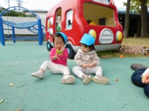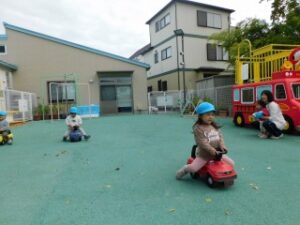 車の玩具に乗ったり、落ち葉を集めたりたくさん体を動かしました。
