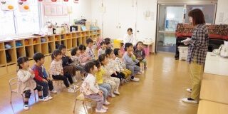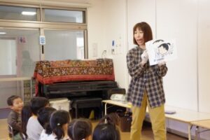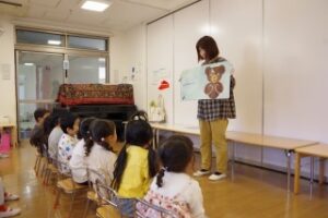 絵カードで様々な体調不良になった際(鼻血や熱)の伝え方を知り、大型絵本でゴミ捨て場の少し可哀そうなクマのお話を見て、身体の部位の練習を行いました。