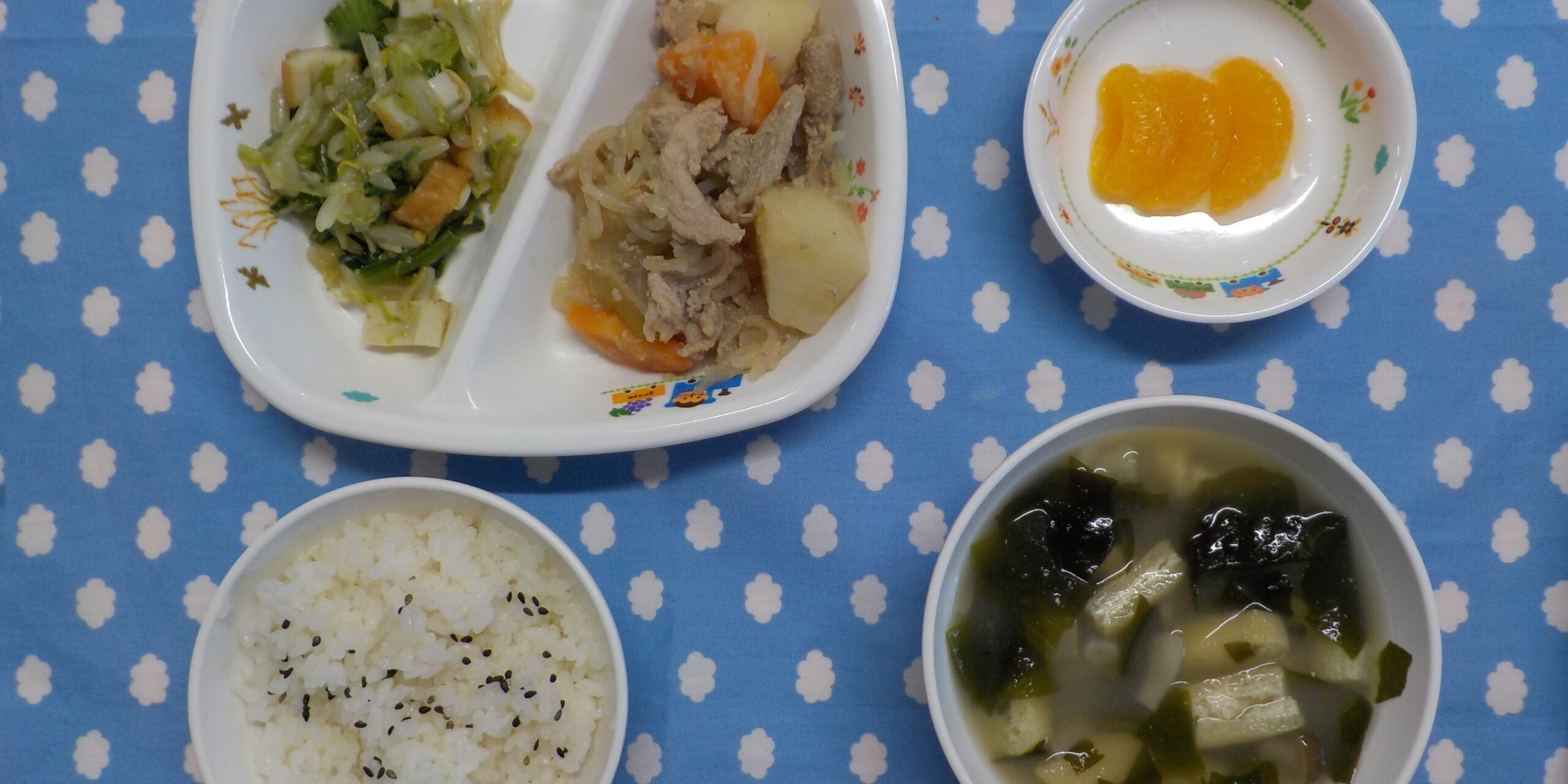 11月292025あおぞら給食 <給食> ・肉じゃが ・こまつなとちくわのナムル ・ごましおごはん ・味噌汁 ・みかん 〇完了食 <おやつ> ・牛乳 ・バナナきなこ ・ウエハース 〇完了食 Category: あおぞら給食2025年11月29日 Share this post Share on FacebookShare on Facebook Share on XShare on X Post navigationPreviousPrevious post:11月29日(土)Related posts11月28日(金)2025年11月28日11月27日(木)2025年11月27日11月26日(水)2025年11月26日11月25日(火)2025年11月25日11月22日(土)2025年11月22日11月21日(金)2025年11月21日11月20日(木)2025年11月20日11月19日(水)2025年11月19日11月18日(火)2025年11月18日11月17日(月)2025年11月17日11月15日(土)2025年11月15日11月14日(金)2025年11月14日11月13日(木)2025年11月13日11月12日(水)2025年11月12日11月11日(火)2025年11月11日11月10日(月) ☆七五三メニュー2025年11月10日11月8日(土)2025年11月8日11月7日(金)2025年11月8日11月6日(木)2025年11月6日11月5日(水)2025年11月5日11月4日(火)2025年11月5日11月1日(土)2025年11月1日10月31日(金)2025年11月1日10月30日(木) ☆ハロウィンメニュー2025年10月30日