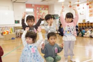 ひまわり組や、あじさい組のお兄さんお姉さんの遊戯見ながら踊りを、笑顔で真似する姿がありました。