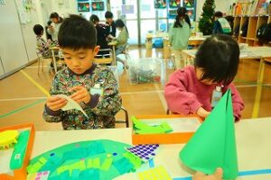 自分たちで切った折り紙をクリスマスツリーのように貼り付けて、
