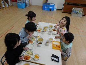 たくさん遊んだ後は、会話を楽しみながら給食を食べていました。
