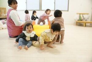 その後、お部屋に入って滑り台や築山をみんなで行い、体を動かして遊びました。
