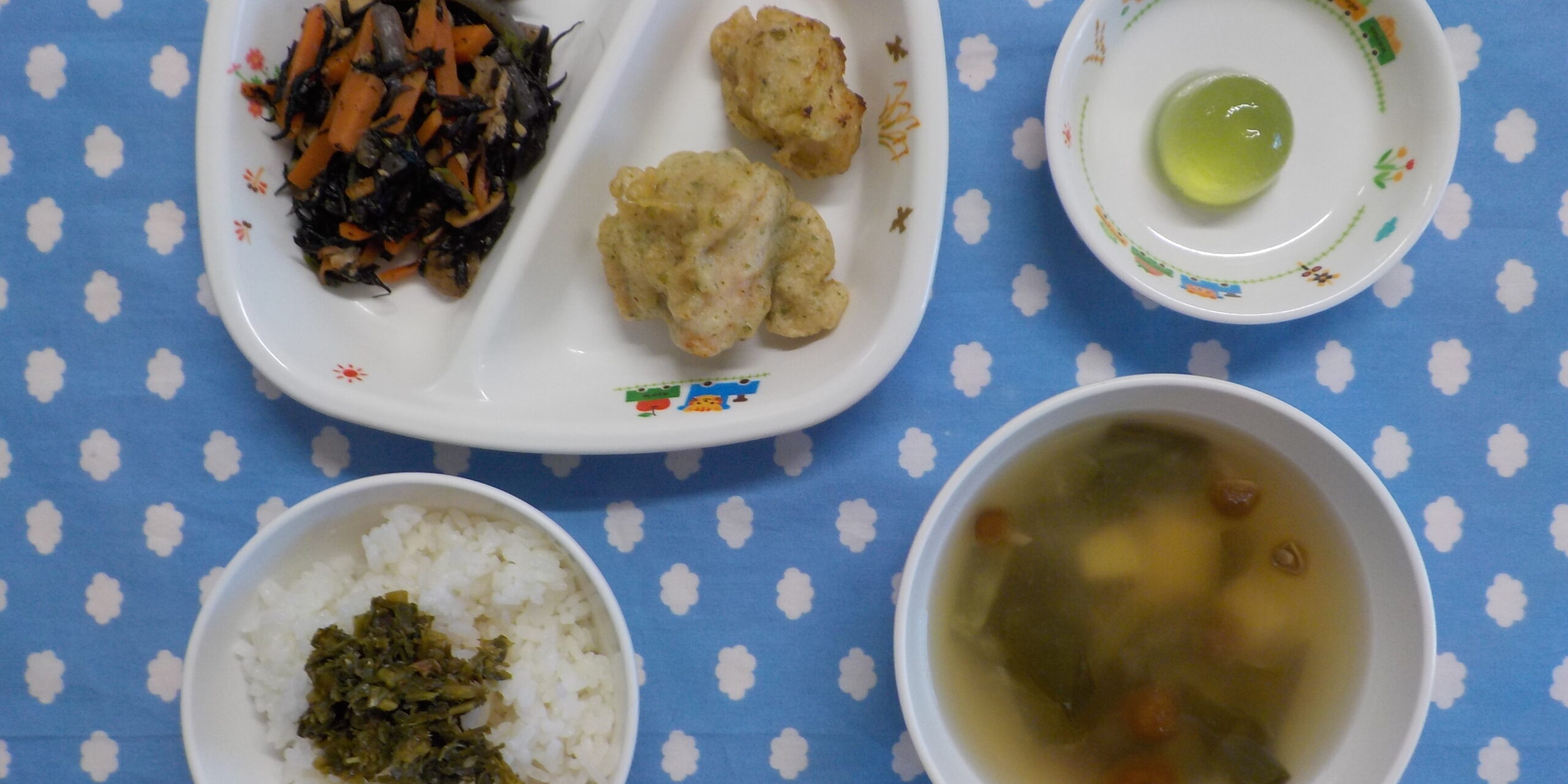 1月222026あおぞら給食 <給食> ・鶏天 ・大豆とひじきの煮物 ・ふりかけごはん ・味噌汁 ・ミニゼリー 〇完了食 ・しゅうまい ・大豆とひじきの煮物 ・ふりかけごはん ・味噌汁 ・ミニゼリー <おやつ> ・牛乳 ・焼きコロッケ 〇完了食 Category: あおぞら給食2026年1月22日 Share this post Share on FacebookShare on Facebook Share on XShare on X Post navigationPreviousPrevious post:1月21日(水) Related posts1月21日(水) 2026年1月21日1月20日(火)2026年1月20日1月19日(月)2026年1月19日1月16日(金)2026年1月16日1月15日(木)2026年1月15日1月14日(水)2026年1月14日1月13日(火)2026年1月13日1月10日(土)2026年1月10日1月9日(金) ☆鏡開き2026年1月9日1月8日(木)2026年1月8日1月7日(水) ☆お正月メニュー2026年1月7日1月6日(火)2026年1月6日1月5日(月)2026年1月5日12月27日(土)2025年12月27日12月26日(金)2025年12月26日12月24日(水)2025年12月24日12月23日(火)2025年12月23日12月23日(月)2025年12月22日12月20日(土)2025年12月20日12月19日(金)2025年12月19日12月18日(木)2025年12月18日12月17日(木)2025年12月17日12月16日(火)2025年12月16日12月15日(火)2025年12月15日