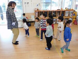 最後は、「鬼のパンツ」の歌に合わせて歩いたり走ったりして体を動かしました。