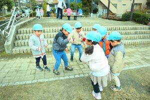 あじさい組に向けて、いつもはひまわり組のお兄さんお姉さんと手を繋いで歩いてる道をなでしこ組のお友だちと手を繋ぎ、頑張って歩きました。