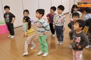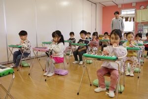 来年度のマーチングに向けて「いち、に、さん、し…」と8の数字まで数をかぞえながら足踏みをしたり、合図に合わせて「ヤー!」と声を合わせたりしてあじさい組への気持ちも高まり、張り切って取り組む姿がありました。