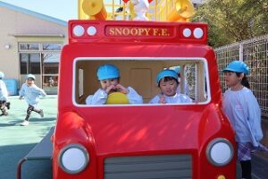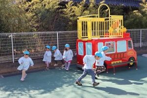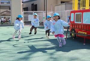 園庭遊びでは、追いかけっこや影踏み遊びなどをして、お友だちと一緒に楽しく遊びました。