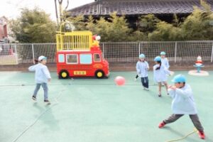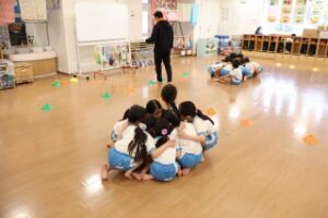 園庭でドッヂボールをする時は自分たちでコートをつくって協力し合っています。