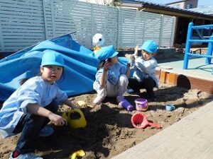 午後は園庭遊びをし、三輪車や遊具(くも)、砂場で楽しく遊びました。