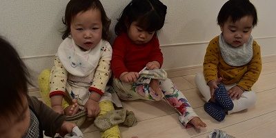 次に、靴下が入った箱を持ってくると自分のを取って履こうと頑張ってくれます。