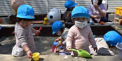 ひまわり組のお兄さんがこいで三輪車の後ろに乗せてもらい