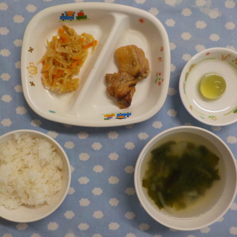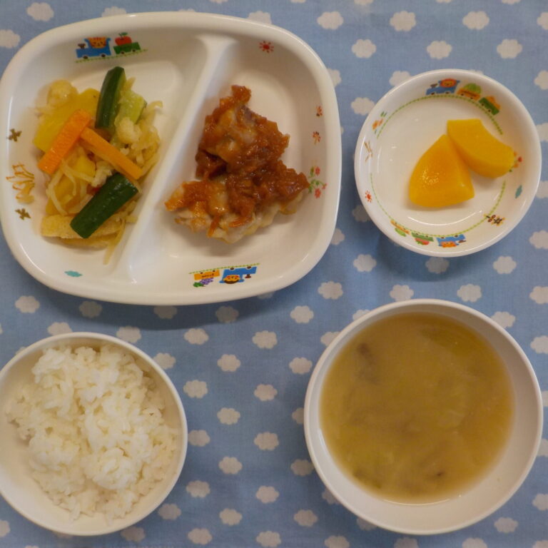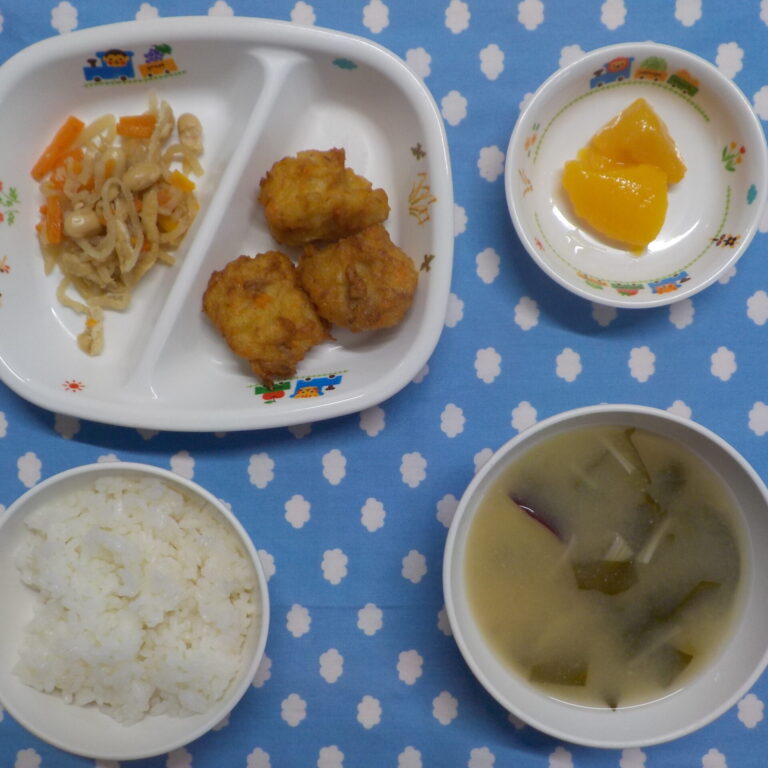 <給食> ・ツナと豆腐の落とし揚げ ・切干大根の煮物 ・ごはん ・味噌汁 ・もも …