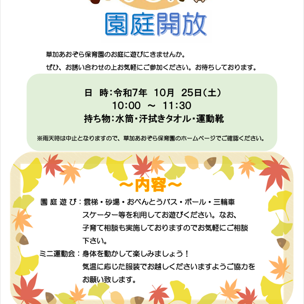 ☆10月の園庭開放のお知らせ☆ 日時:令和4年10月22日(土)10:00~11:30 内容:園庭遊び、ミニ運動会 園庭にある遊具で遊んだり、親子でミニ運動会を行います。 動きやすい服装でお越し下さい。 子…